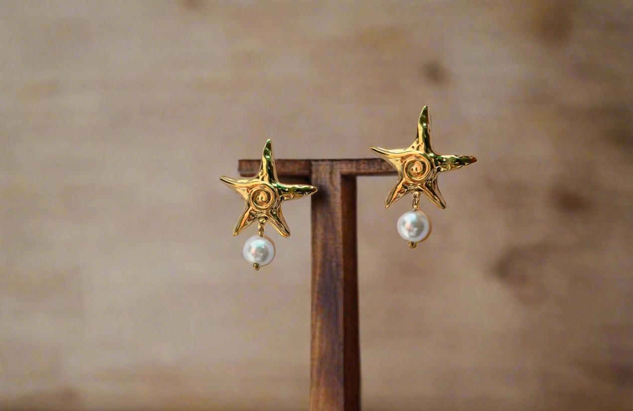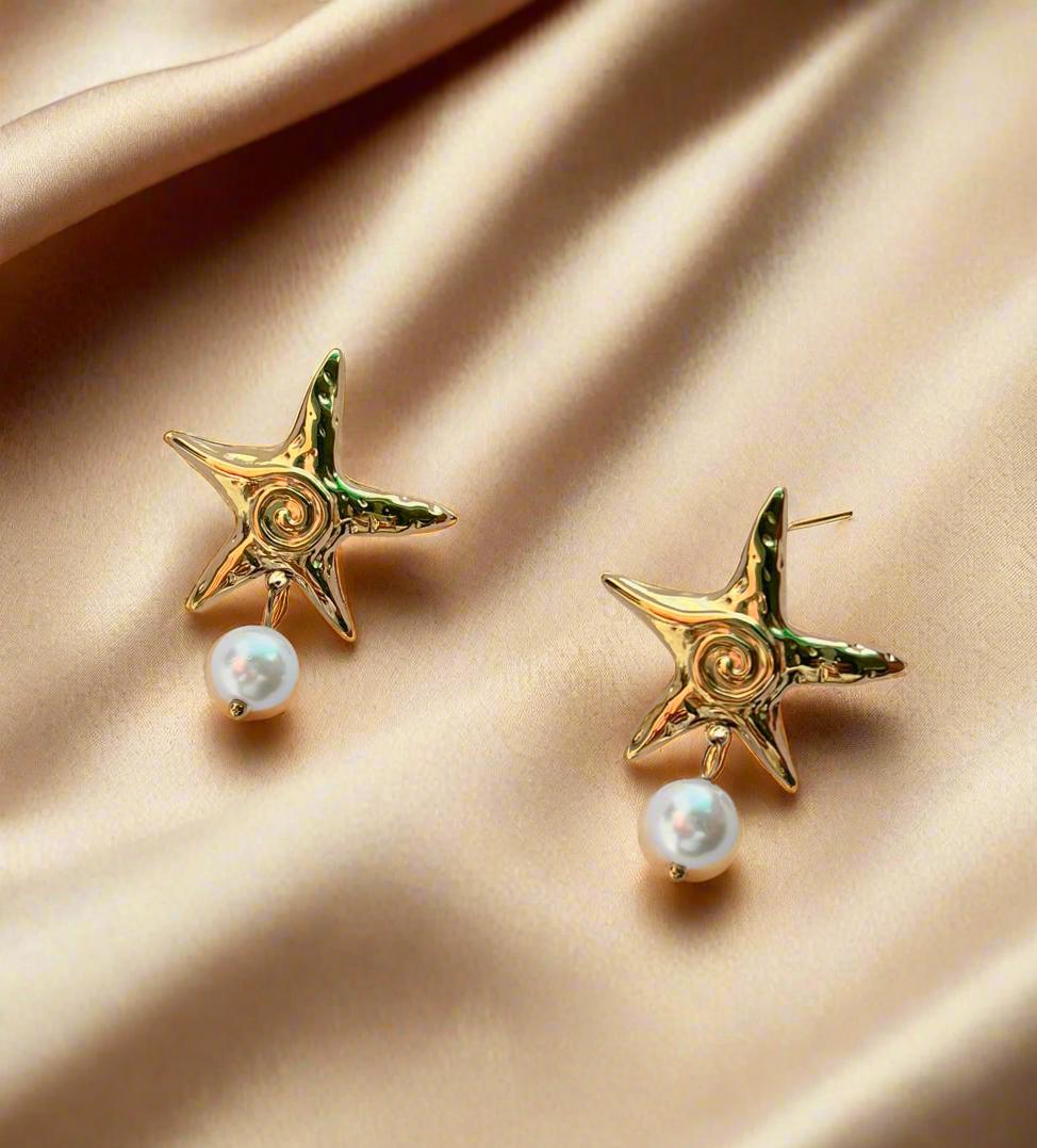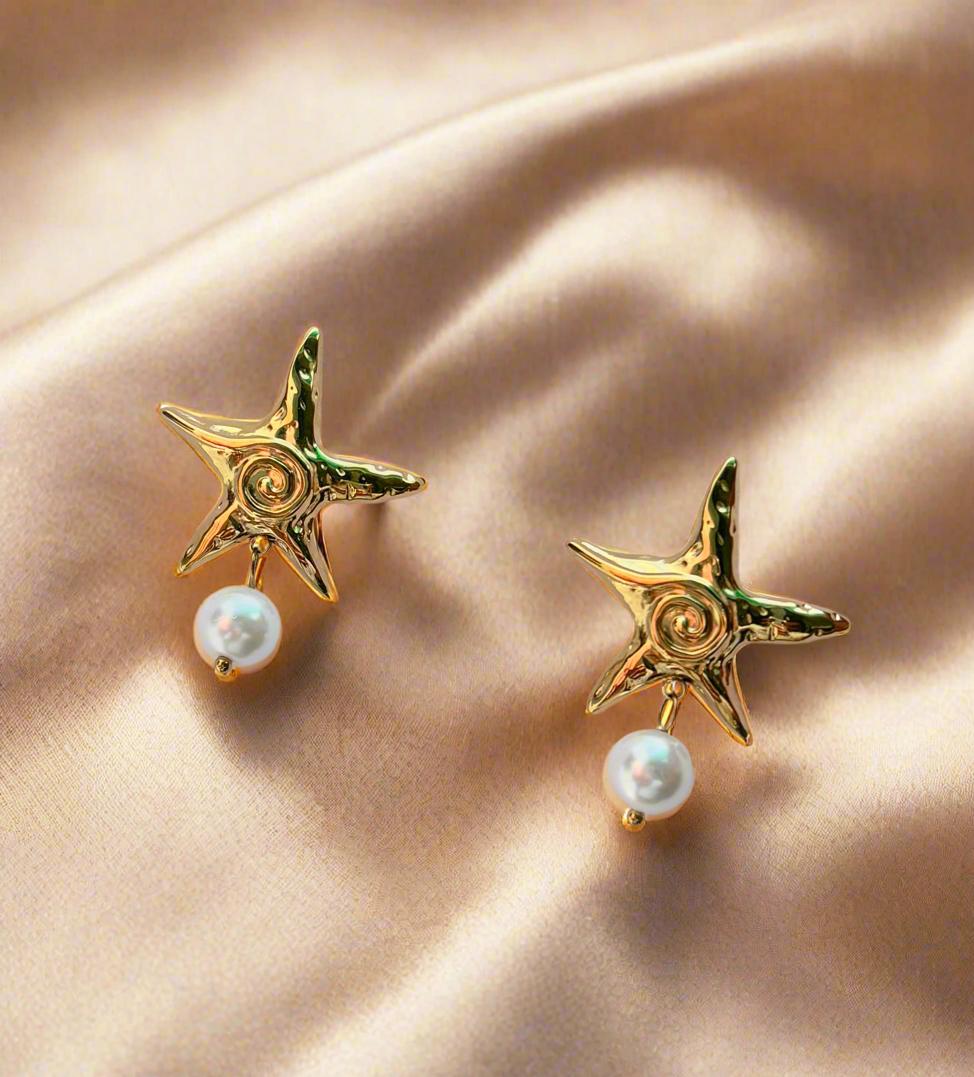 Featuring a delicate star-shaped design paired with a graceful dangling pearl, these earrings capture the magic of twilight and the glow of distant galaxies. The shimmering star adds sparkle, while the pearl brings timeless sophistication – together creating a look that is modern, dreamy, and unforgettable.