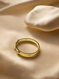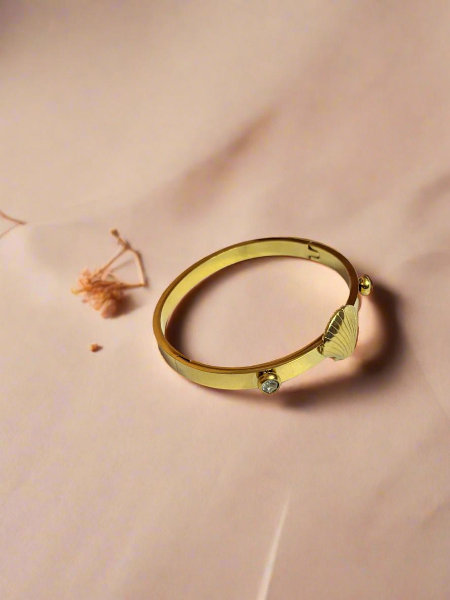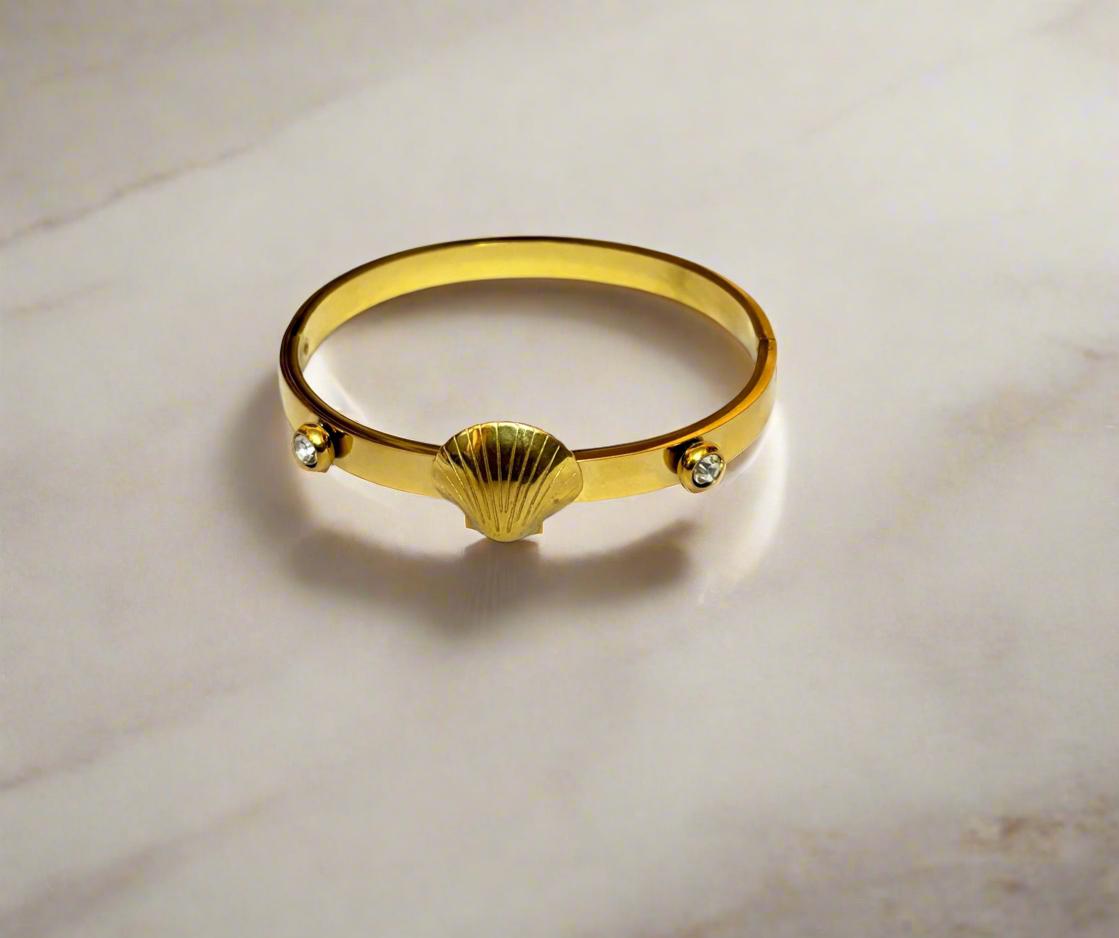 The bracelet features a polished golden band, adorned with a delicately sculpted shell motif at its center, flanked by subtle diamond-like accents on each side. This balance of form and sparkle creates a piece that is both minimal and luxurious Β perfect for everyday wear, yet refined enough for grand occasions.