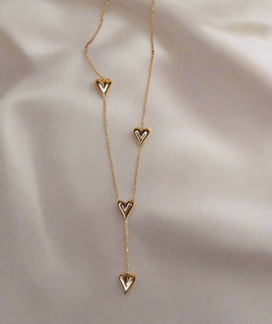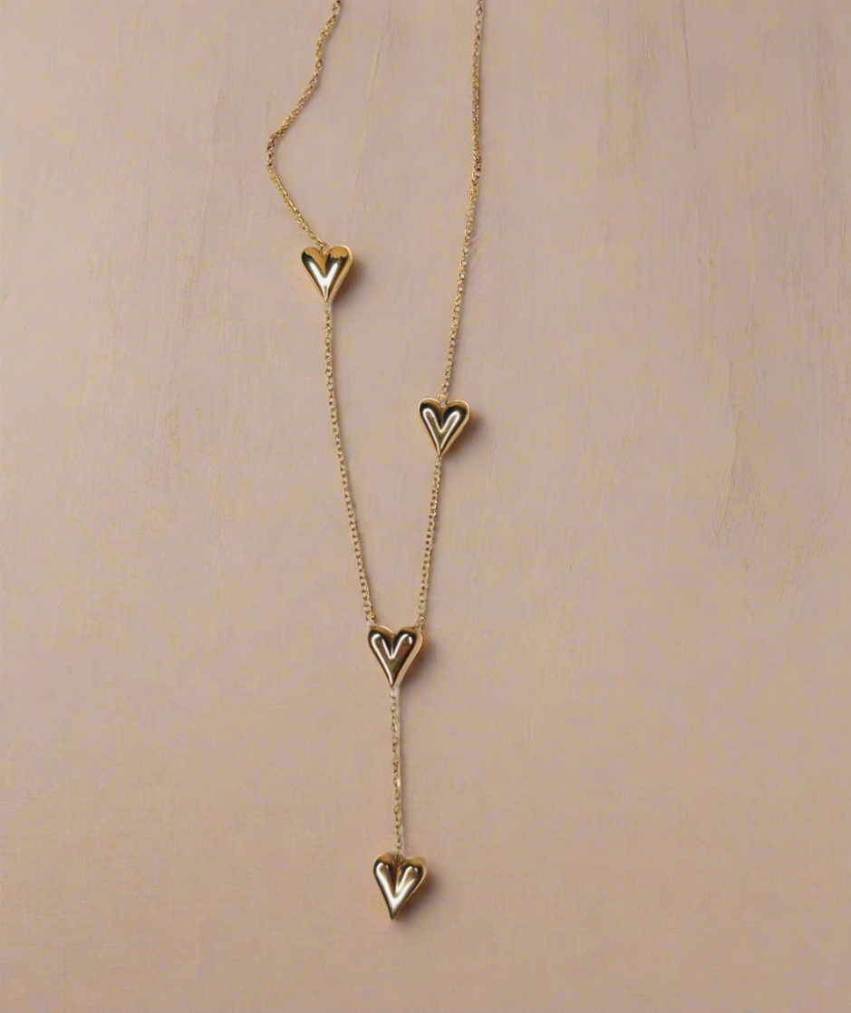 Crafted with a sleek gold-toned finish, the Hearts in Harmony Lariat Necklace features a cascading trio of sculpted heart charms Β each symbolizing connection, emotion, and timeless beauty π«